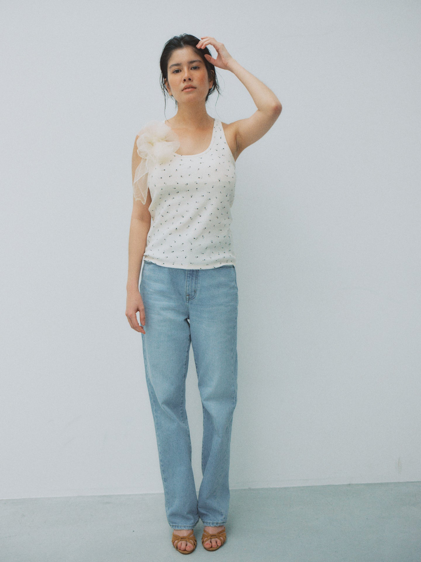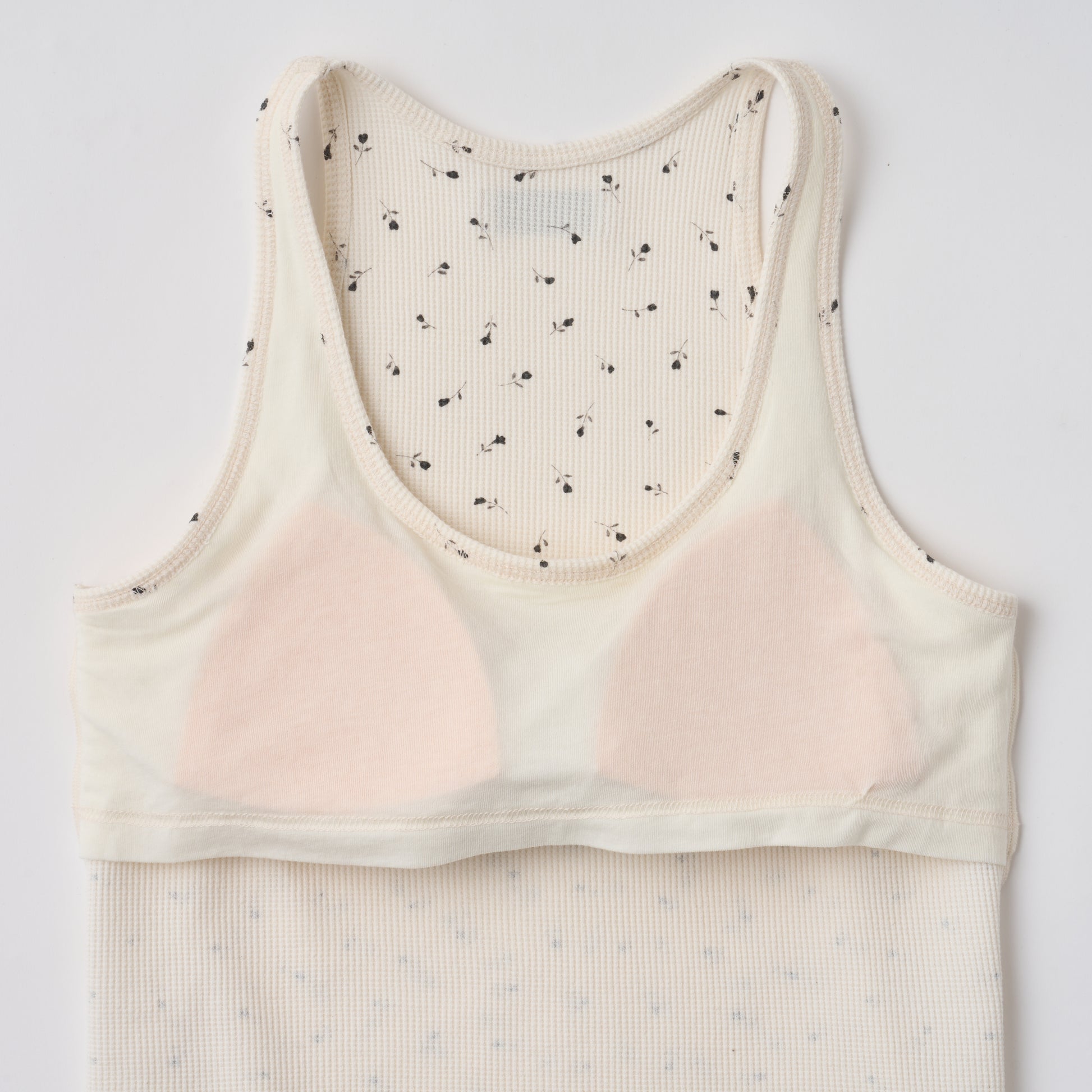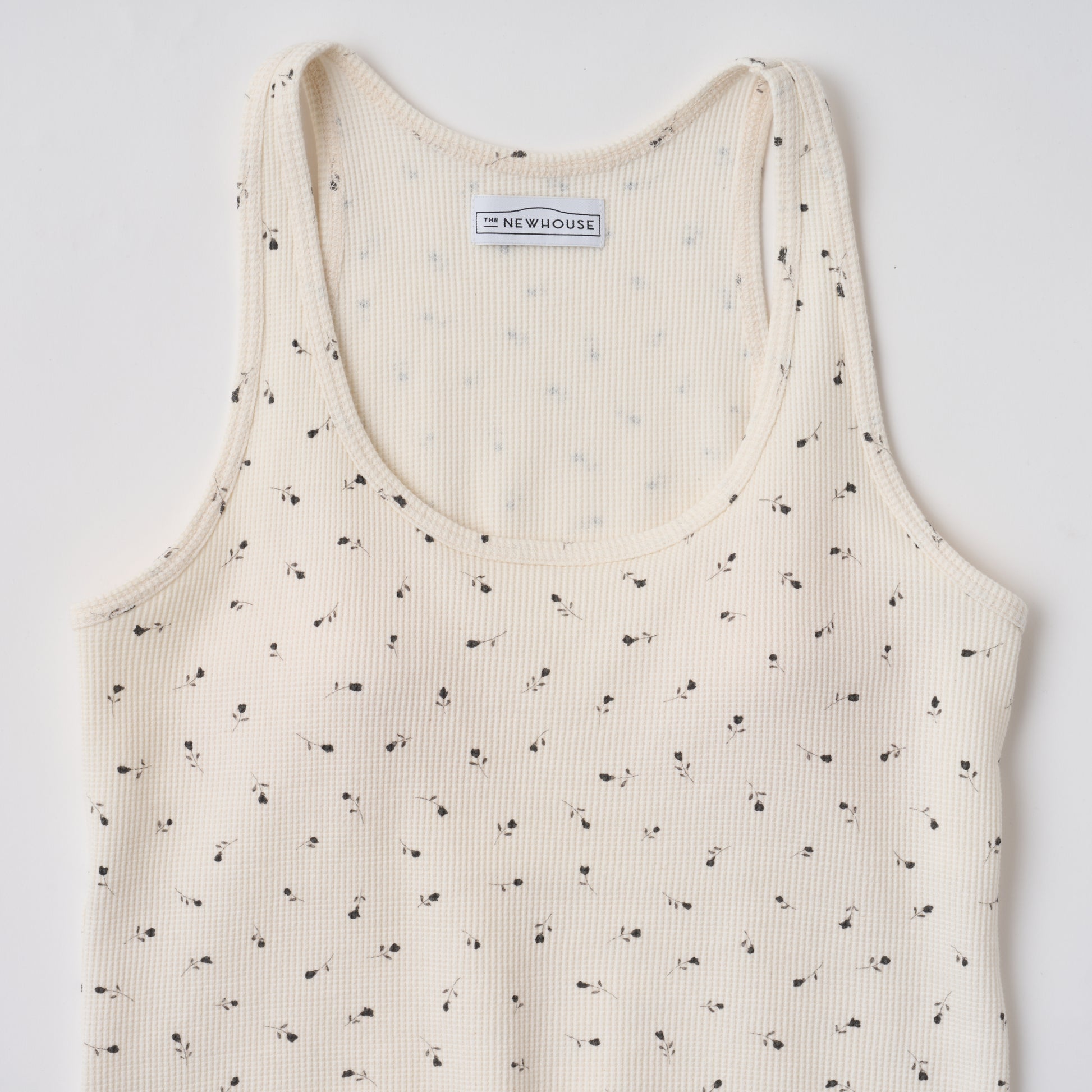 夏のTHE NEWHOUSEに欠かせない、COOPERシリーズのリニューアルモデル。大人のためのカップ付きタンクトップ「COOPER TANK TOP」に、ワッフル素材のニュアンスを加えました。肌あたりのやわらかなワッフル生地に、モノトーンの小花柄をプリント。甘さを抑えたバランスで、さりげなく女性らしさを引き立てます。シルエットは美しく整えられたラインで、レイヤードにも自然に馴染む設計に。カップは柔らかな生地でしっかりと固定され、ズレにくく、快適な着心地を保ちます。一枚で軽やかな存在感を持ちながら、スタイリングにやさしいニュアンスを添える一着です。