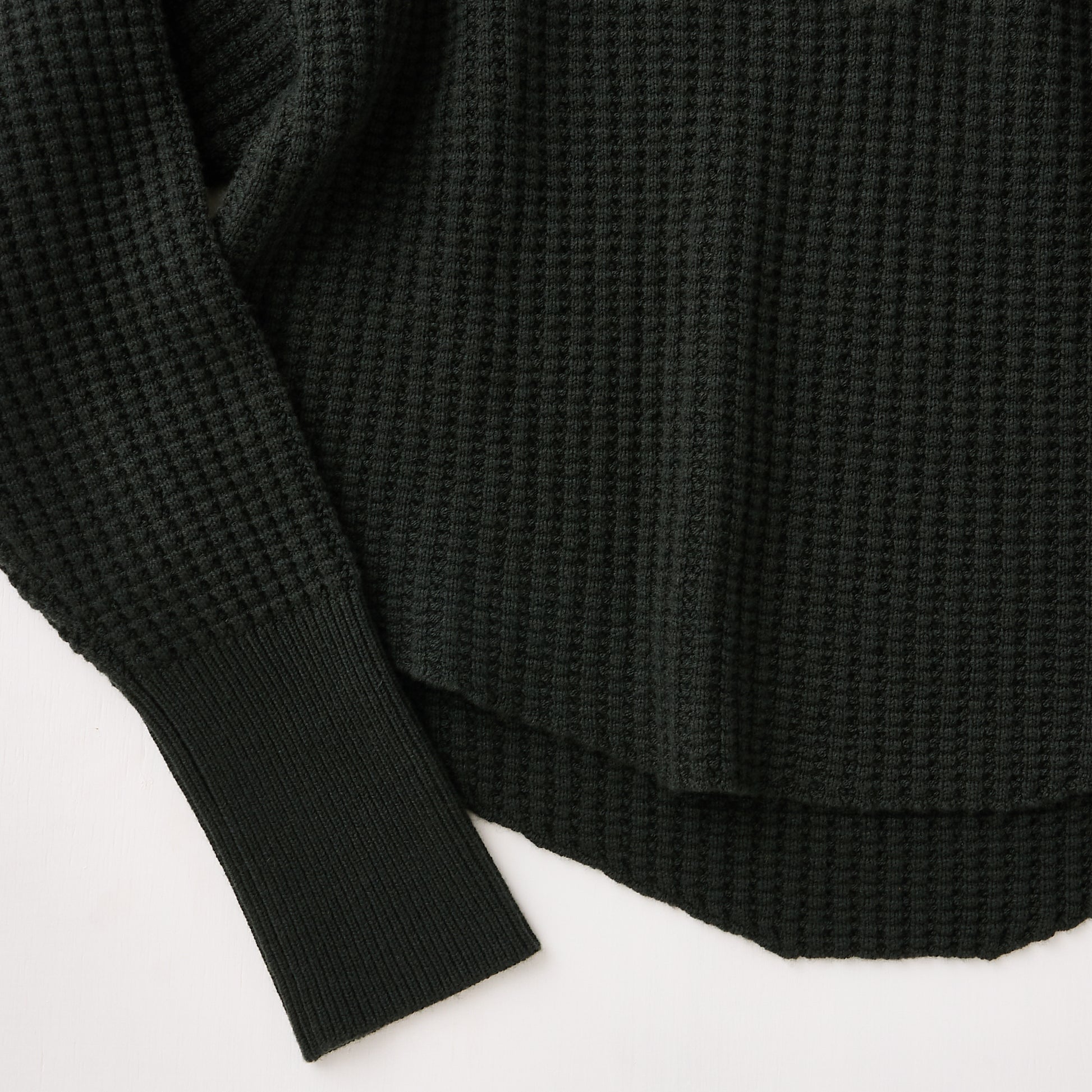 これからのウィンターシーズンにぴったりな、思わず抱きしめたくなるワッフルニットFRANKIE SWEATERが登場です。上質なウールにカシミヤをブレンドしたニット地は、肌に馴染むような柔らかさが魅力。厚手に編み上げてもなお、ボディラインを引き立てる落ち感が楽しめます。カラーはパステルピーチ、ミネラルグレー、クリフブラウン、ブラックフォレストの4色展開。甘すぎないニュアンシーなカラーを揃えました。CALVERT PANTのような張りのある素材のボトムとの相性は抜群。もちろんいつものデニムにばさっと合わせて、レイドバックなムードを楽しむのも素敵です。ラクシーなアイテムこそ、上質な素材と計算されたシルエットで。今季のステディニットになってくれる一枚です。