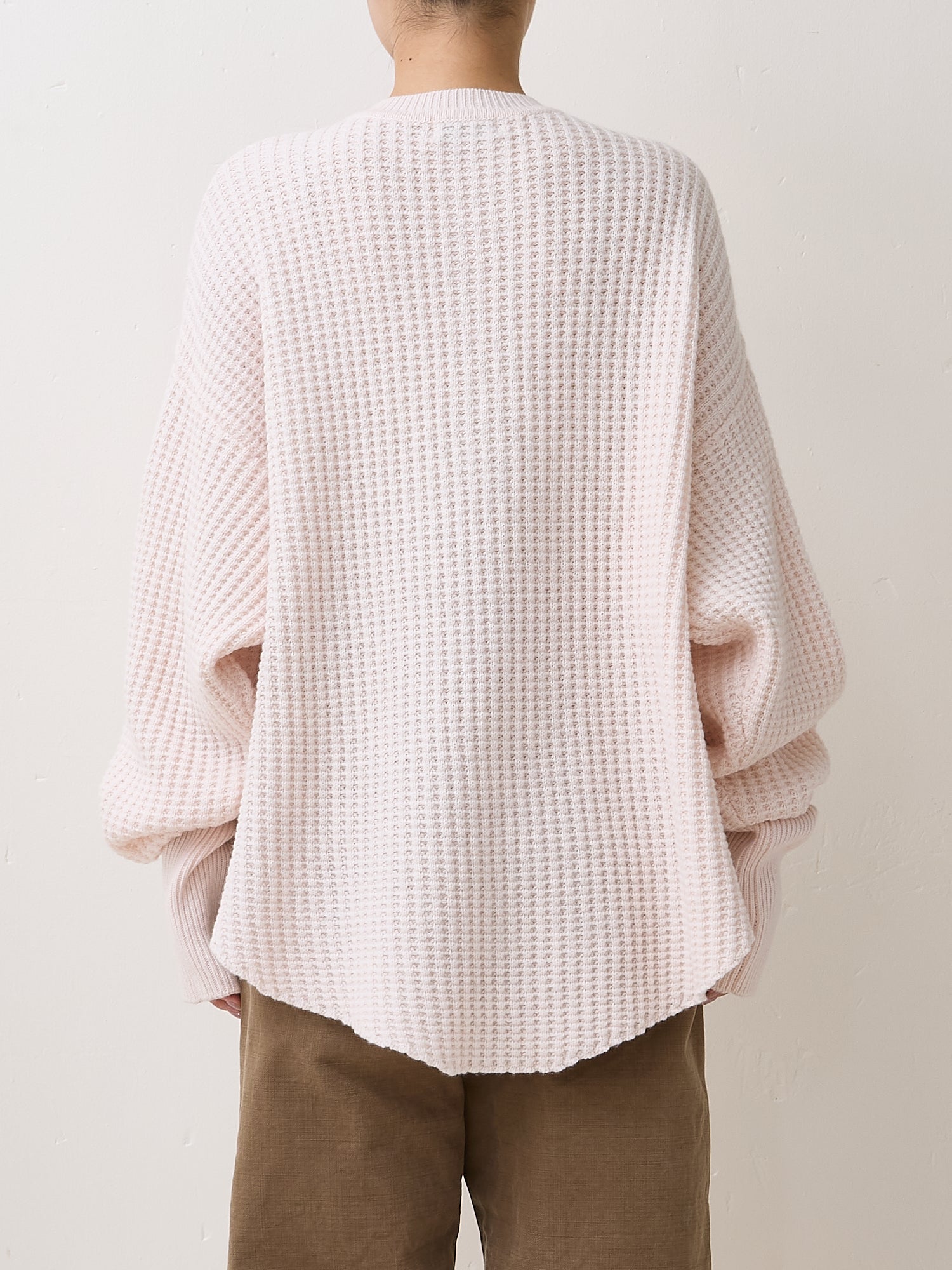 これからのウィンターシーズンにぴったりな、思わず抱きしめたくなるワッフルニットFRANKIE SWEATERが登場です。上質なウールにカシミヤをブレンドしたニット地は、肌に馴染むような柔らかさが魅力。厚手に編み上げてもなお、ボディラインを引き立てる落ち感が楽しめます。カラーはパステルピーチ、ミネラルグレー、クリフブラウン、ブラックフォレストの4色展開。甘すぎないニュアンシーなカラーを揃えました。CALVERT PANTのような張りのある素材のボトムとの相性は抜群。もちろんいつものデニムにばさっと合わせて、レイドバックなムードを楽しむのも素敵です。ラクシーなアイテムこそ、上質な素材と計算されたシルエットで。今季のステディニットになってくれる一枚です。