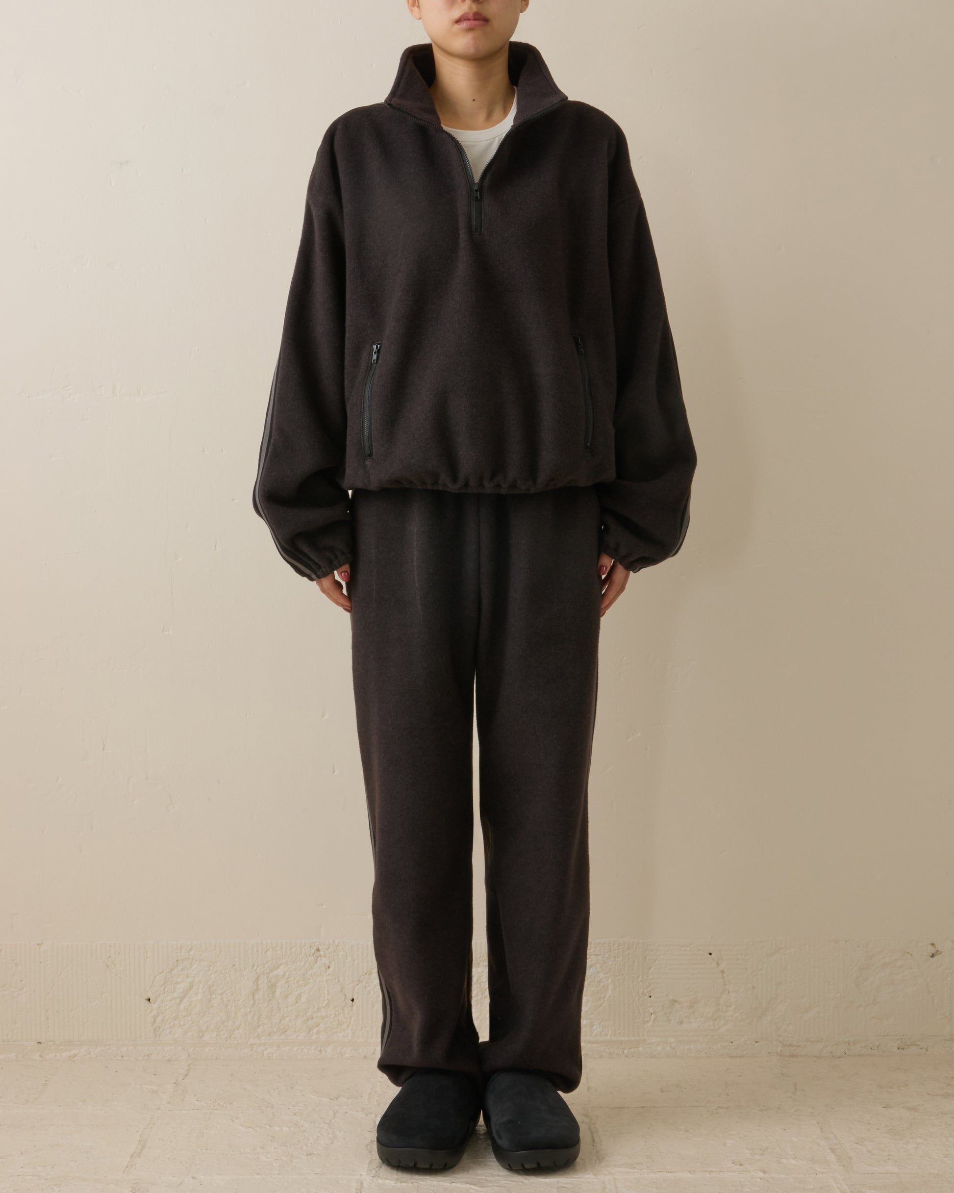 ウィンターシーズンになくてはならないのは、ウォーム&ファンクショナルなフリース。ポリエステルにレーヨンをブレンドしたフリース生地は、思わず頬擦りしたくなるような滑らかさ。しっかり厚みもあるので、だらしなく見えることがありません。形はトレンドのハーフジッププルオーバー。オーバーサイズながらコンパクトな丈感です。ショルダーの落ち具合や、袖の溜まり具合まで計算し尽くしました。また、サイドにはラインを入れ、スタイリッシュなアクセントに。ネックはジップを上まであげても顔に当たらないよう、下がりをつけています。さらに配色にすることで、一味違う大人のフリースへとアップデート。カラーはベージュ、グリーン、ブラックの3色をご用意。どれも奥行きのあるこなれたカラーです。ぜひ同シリーズのHARPER PANTと合わせてセットアップで楽しんで。毎日でも着たくなってしまうコンフォートなフリースシリーズは、この冬のステディです。