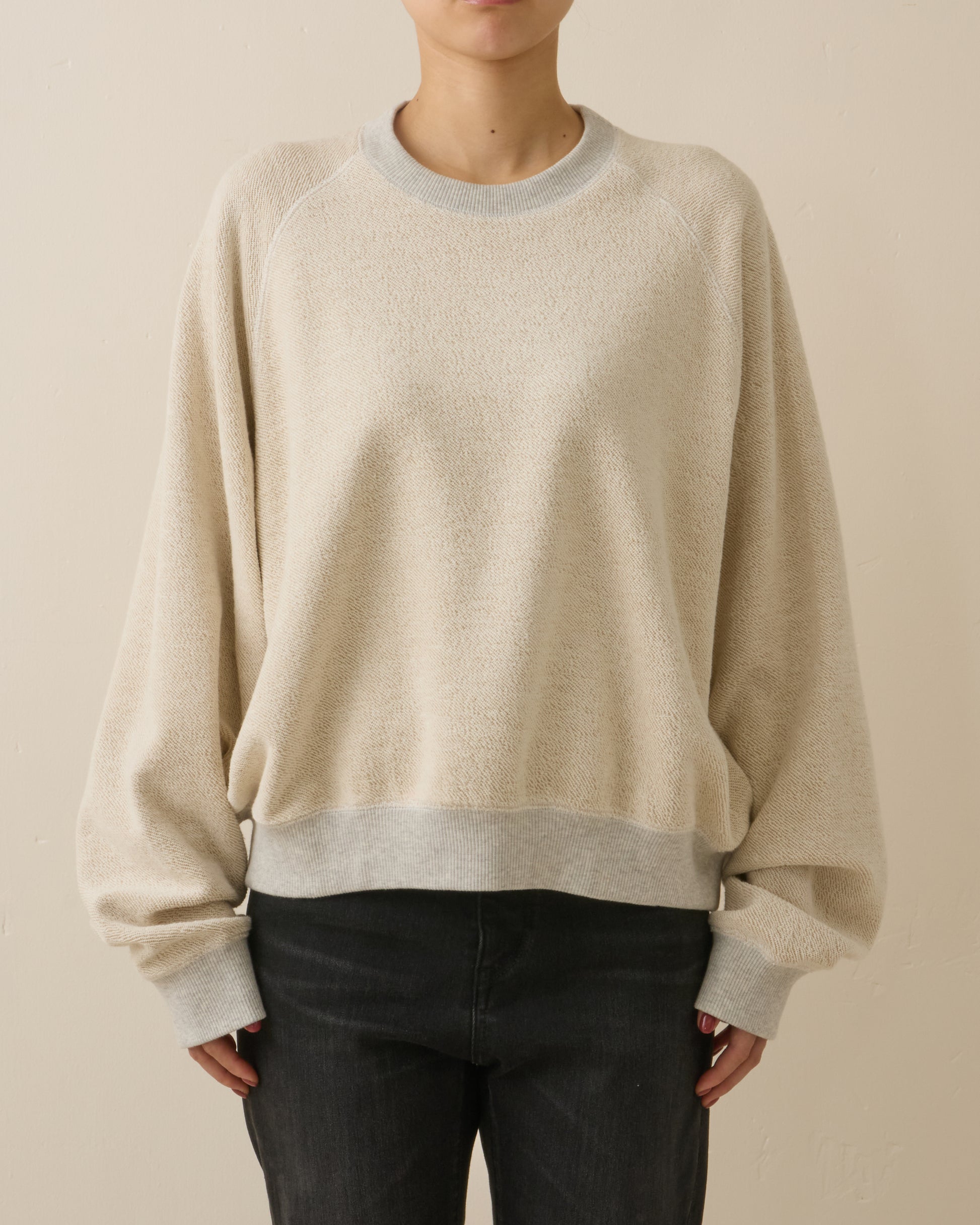 カジュアルファッションの代表的なアイテム・スウェットを、THE NEWHOUSEらしいアイディアでアップデートした、ユニークな一枚。コットン100%のスウェット生地をあえて裏使い。さらにアクセントとなるカラーのリブを配し、ヴィンテージのリンガースウェットのようなこなれた印象を生み出しました。ゆったりとしたラグランスリーブながら、丈感はコンパクトなので、いつものデニムはもちろんのこと、ワイドレッグのレザーボトムスや膝丈のショートパンツなど、様々なボトムスとマッチします。カラーはホワイト、ベージュ、オレンジの3色をご用意しました。今シーズンは古着のネルシャツを合わせるような、ヴィンテージミックススタイルに取り入れていただくのがおすすめ。ぜひミックススタイルの妙を楽しんで。