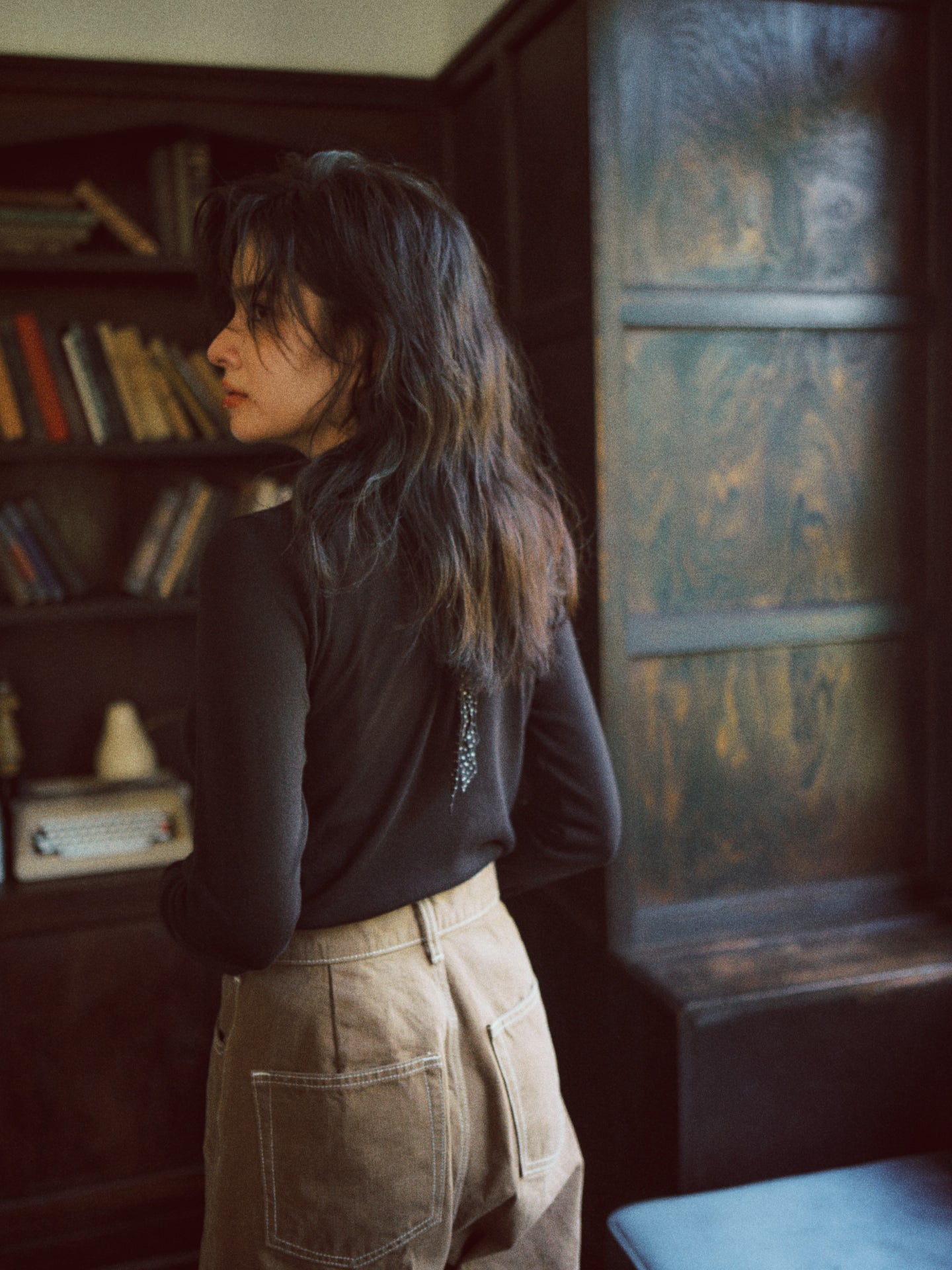 経験を重ねたマチュアな大人にとって、「おしゃれは我慢」なんてナンセンス。モードかつ着心地にこだわったアイテムこそがステディです。そこでお届けしたいのが、シンプルなカットソーをTHE NEWHOUSEが得意とするコットンカシミヤで編み上げたTHURLOEシリーズ。カシミヤを10%も配合した生地は、軽く美しい透け感を持つだけでなく、とても温か。ボディラインを美しく引き立てながら、余計なものを拾わないコンパクトなシルエットです。THURLOE CREW NECKはシンプルな形だからこそ、ショルダーにアクセントとなるディテールを入れ、スリーブを長めにとってフェミニティを感じさせるデザインに。カラーはニュアンシーなアイボリー、シックなスモークブルー、旬のコーヒー、エレガントなブラックの4色展開。展示会で大人気だったコーヒーは、RAGFORD JACKETのようなトレンドのブラウンアウターのインに合わせ、ワントーンコーデを楽しむのがおすすめです。大人のわがままを納得させてくれる一枚。ぜひ袖を通してみて。