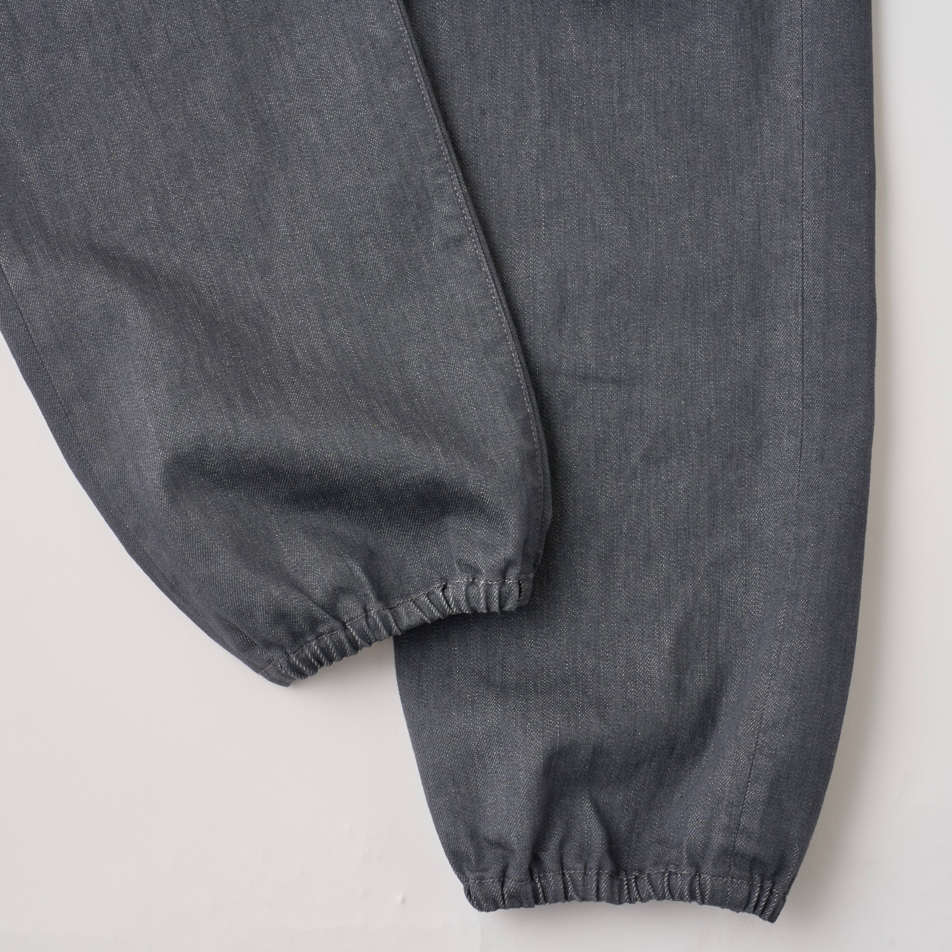 ハイウエストの5ポケットのクラシックなディテールに、裾のゴム仕様というラフな要素を掛け合わせることで、どこかスウェットパンツのような抜け感を表現。